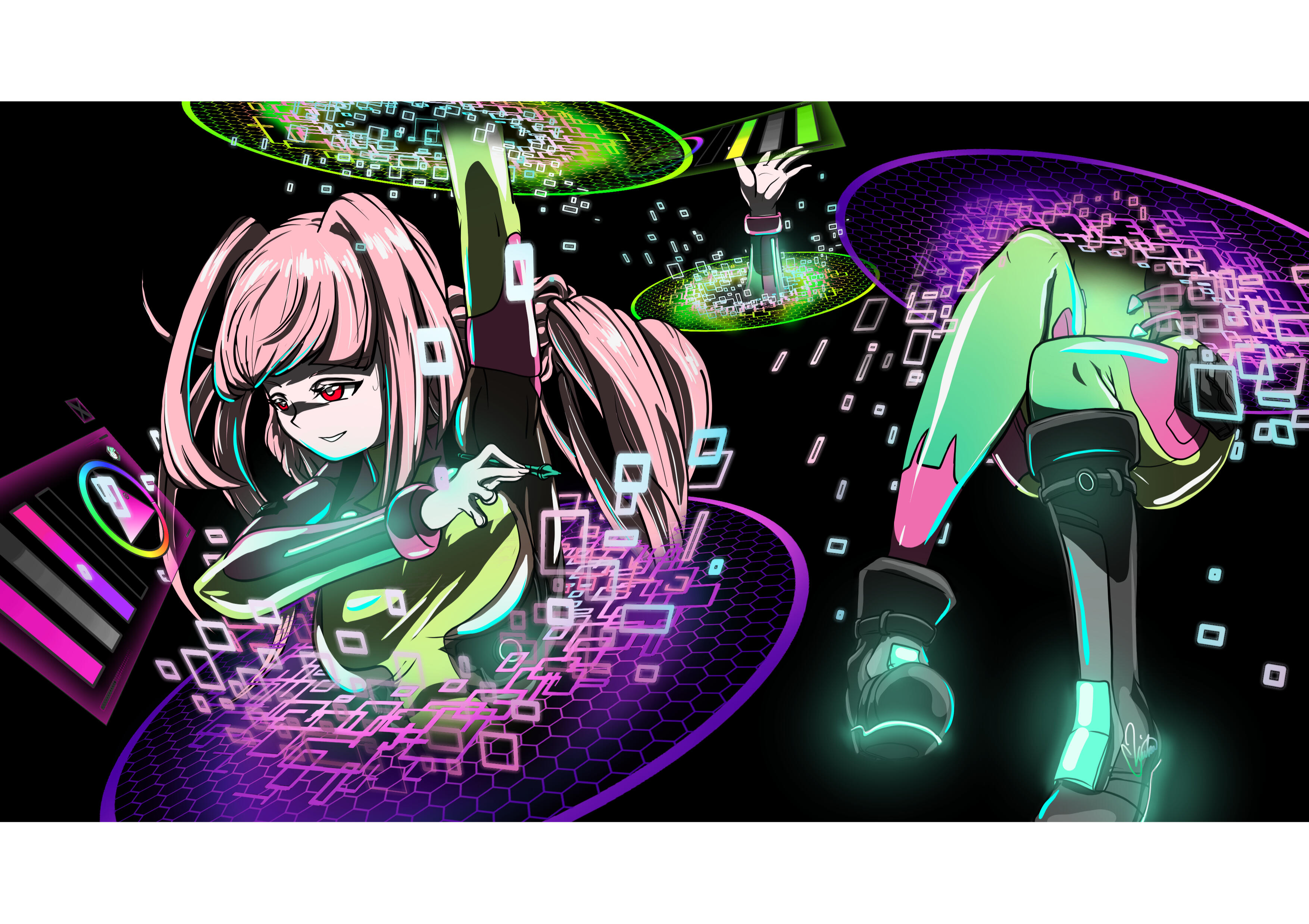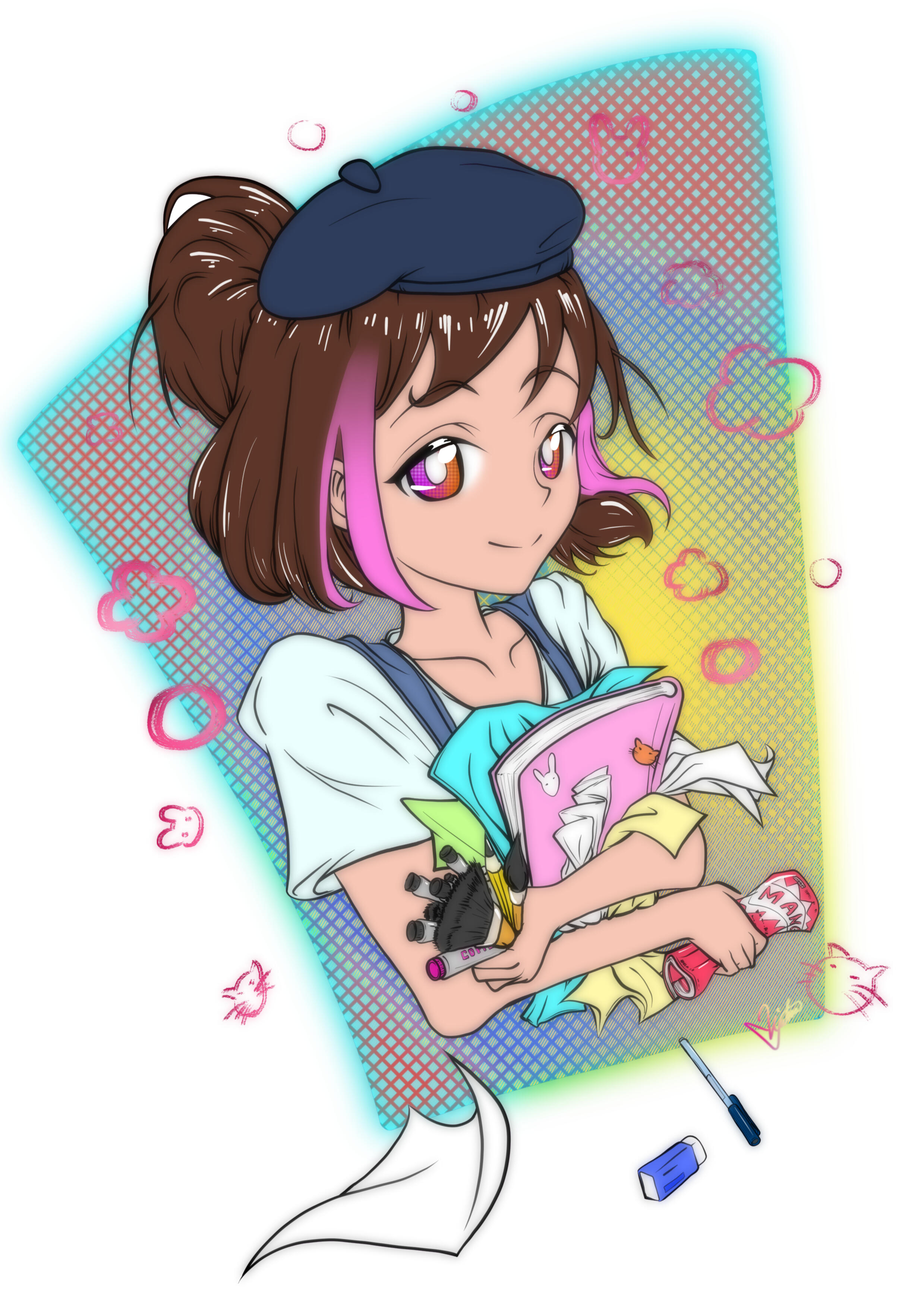 Mirai is my third character I ever designed, which concludes the main-characters for my world-building. My love for the colour pink-magenta (for her design) originated from my love to purple Lumen from 'Rayman 3 - The Great Havoc'. The design of purple circles gave me a hint to what Mirais brush should look like and do.Her 'outfit' is supposed to be an upgrade from Narus outfit, however it is adjusted and custom designed to her brush handling. I like assymetry, which suits Mirai very well to her effect-brush.