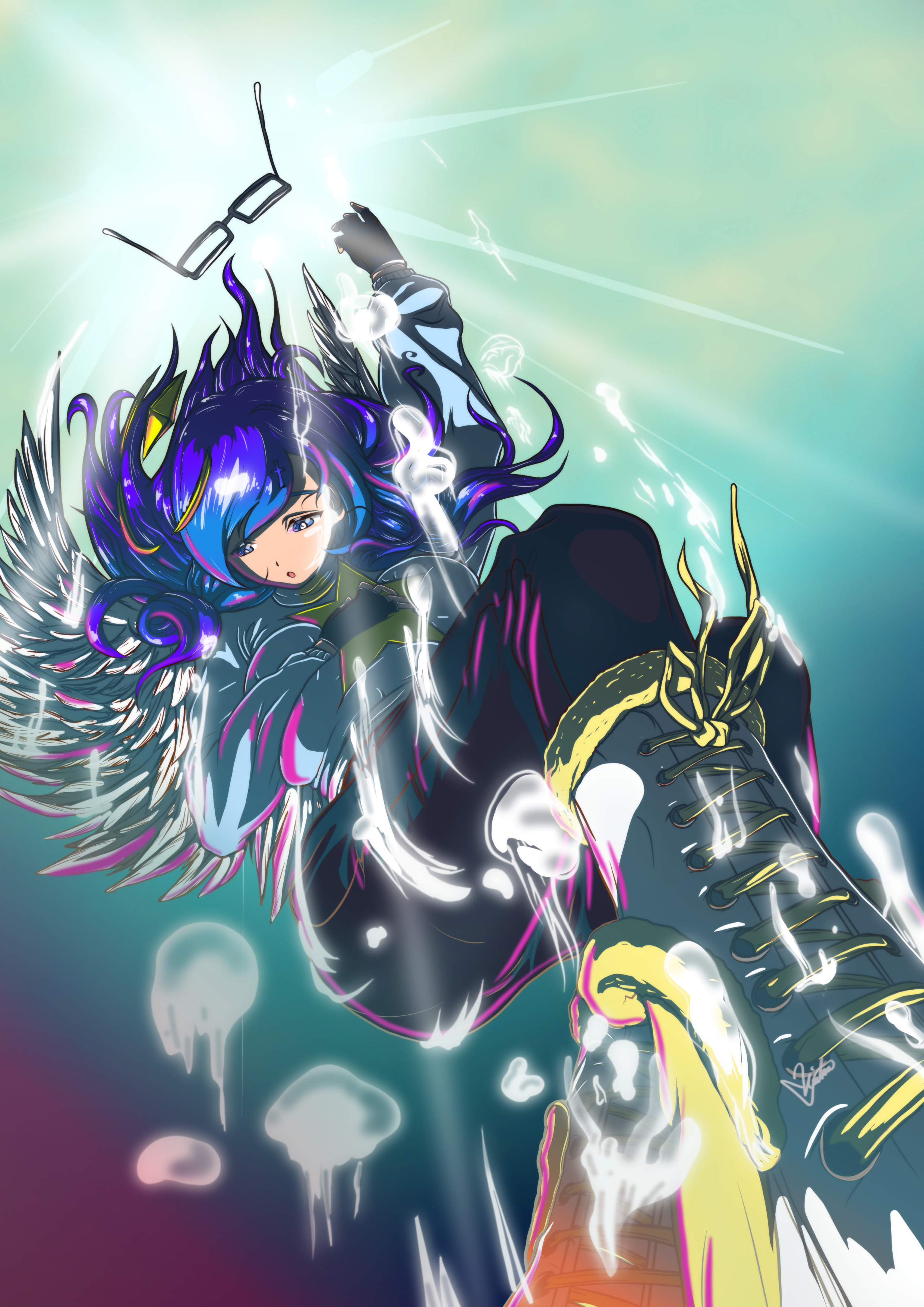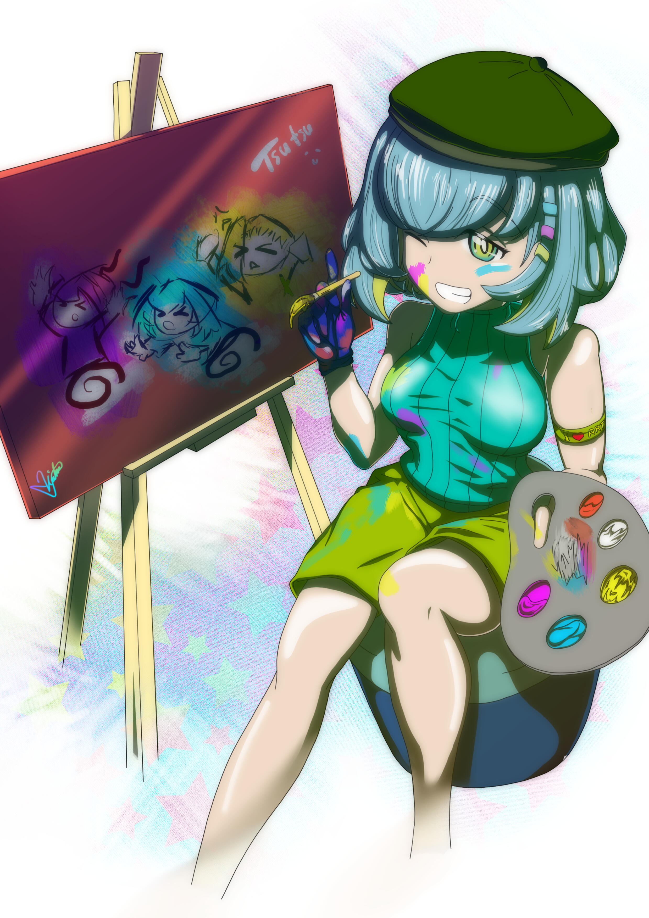 Tsunagari is my first character I ever designed, the tought of having an artist going for battle was very fascinating. My love for the colour blue decided the colourplate for her design.Since I needed to have more practise on drawing poses, I didnt gave much tought about her 'outfit' and ended up with a tight battlesuit with tactical elements. I hope to create my manga around her someday, that would make me really happy.